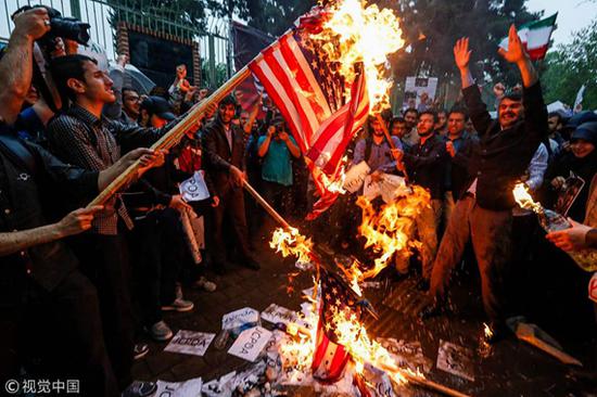 当地时间2018年5月9日,伊朗德黑兰,伊朗民众在前美国大使馆总部外示威,抗议美国退出伊核协议(@视觉中国)