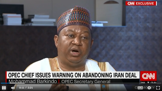 OPEC秘书长巴尔金都在被问及美国若退出伊朗核协议的后果时称,OPEC将继续努力稳定油市(CNN视频截图)