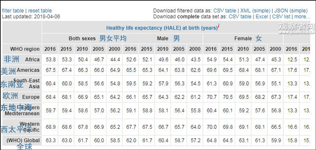 世卫组织统计的各地区婴儿出生时的健康预期寿命(截图自世卫组织官网)