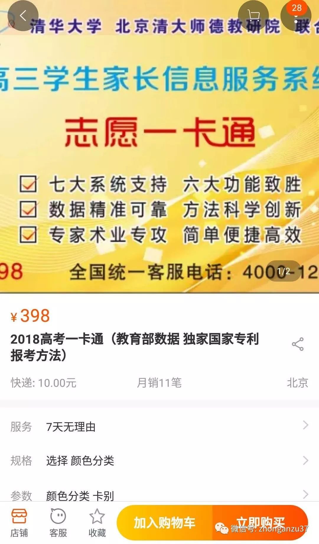 據網頁商品介紹,志願一卡通包含教育部5年來各大院校錄取數據、各大院校介紹及特色、各個專業簡析等,考生可按專業、院校、排名等得出報考方案。客服人員在電話中表示,後臺有10年的教育部報考數據可供參考。