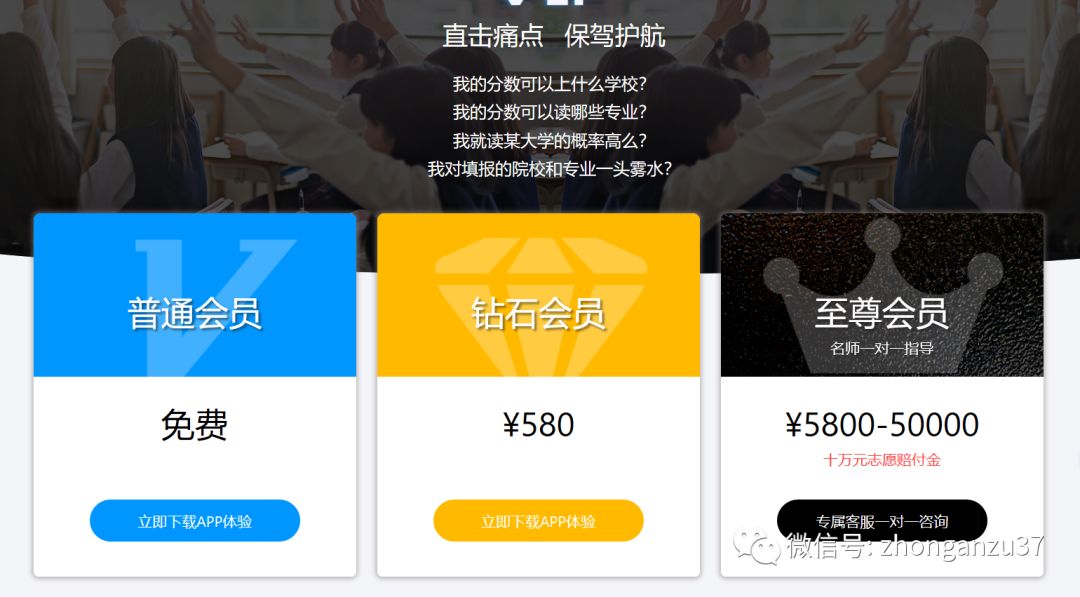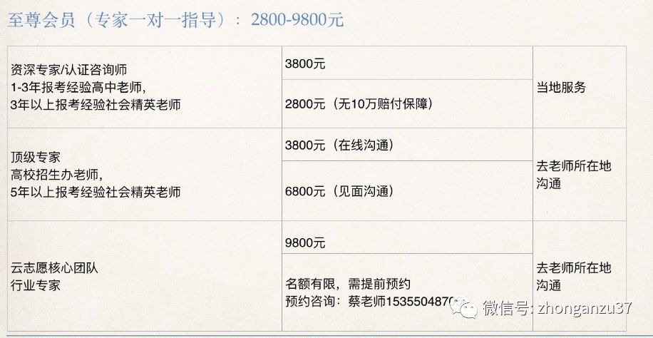 一家名爲雲志願的高考志願填報輔導網站,至尊會員(專家一對一填志願)標價5800到50000元。雲志願客服告訴記者,專家一對一的價格實際沒有網站上標得那麼高,專家分爲資深專家、頂級專家、雲志願核心團隊三類,價格從2800元到9800元。“和專家面談需要預約,一般爲一次。”雲志願的客服稱。