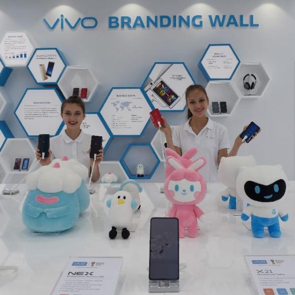 在莫斯科盧日尼基體育場,工作人員在VIVO公司設立的展示臺展示VIVO手機。新華社記者 王毓國 攝