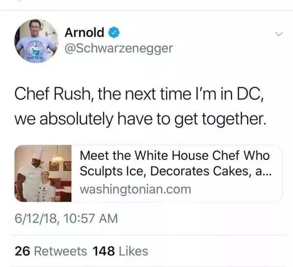 施瓦辛格也在推特上轉發對拉什的報道並留言說:“拉什廚師,下次我去華盛頓,我們一定要聚一聚!”
