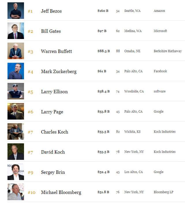 美國富豪再次經歷創紀錄一年。1994年以來,榜首首次易主——傑夫·貝佐斯名列榜單第一。貝佐斯也是首位身家超過1,000億美元的上榜富豪。