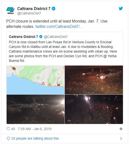 由于洪水和泥石流的問題,Malibu市的PCH高速从Encinal Canyon Road向洛杉矶县以西的两个方向被关闭。下午7点左右,有三辆车在Deer Creek Road与高速公路交接的地方,被泥石流埋住。文图拉县消防队长Dennis O'Shea則告訴媒體,泥土和碎片形成的泥石流宽约100码,深度可能达到4英尺。
