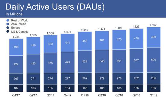 今年第一季度,Facebook在歐洲每天有2.86億活躍用戶,比前一季度增加了400萬。該數字標誌着繼2018年上半年下降之後,歐洲連續第二個季度實現增長。