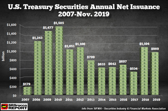 2008-2009年金融危機之後,美國政府赤字激增,被迫“淨髮行”更多美國國債。