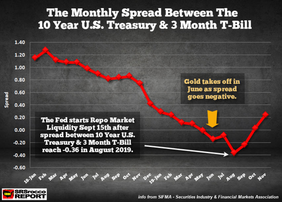 金價在6月開始上漲也並非巧合。到8月,隨着10年期/3個月期美債收益率差進一步深入負值領域,金價繼續攀升,月底觸及1560美元的峯值。之後,美聯儲於9月中旬開始回購操作,並在10月中宣佈每月購買600億美元美債。