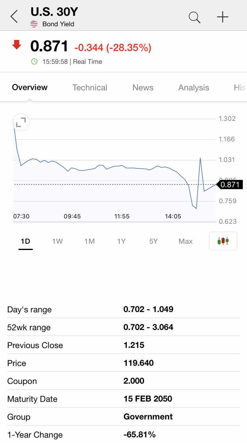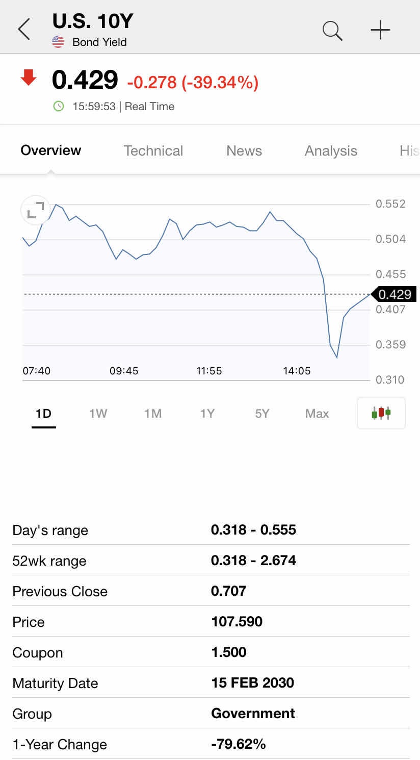 全球資產的避風港——美國10年期國債收益率一路下探,於北京時間3月9日下午一度跌破0.4%關口,一度跌至0.318%,日跌幅近40%!30年期美國國債一度呈破“0.7”之勢,下探至0.702%,續刷歷史新低,日跌幅近30%!