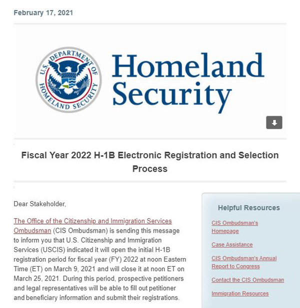 美國移民局(USCIS)管辖的2022財政年度H-1B VISA工作签证的初始电子註冊期,即将开始: