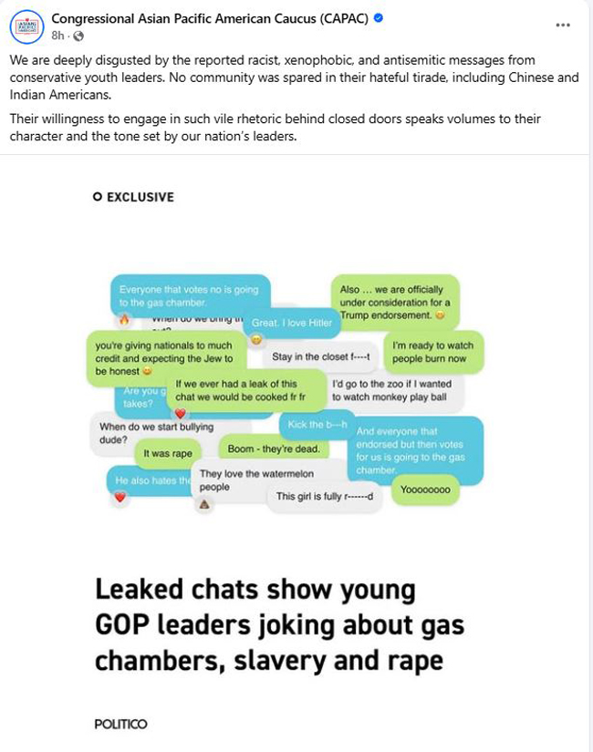 【美新社讯】10月15日,美国国会亚太裔核心联盟(CAPAC)主席孟昭文众议员(Rep. Grace Meng,NY-06)就《政客》POLITICO 新闻报道揭露数千条来自年轻保守派领袖的种族、仇外和反犹太主义聊天信息,而发表以下声明: