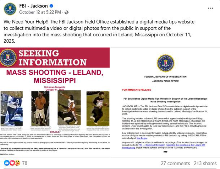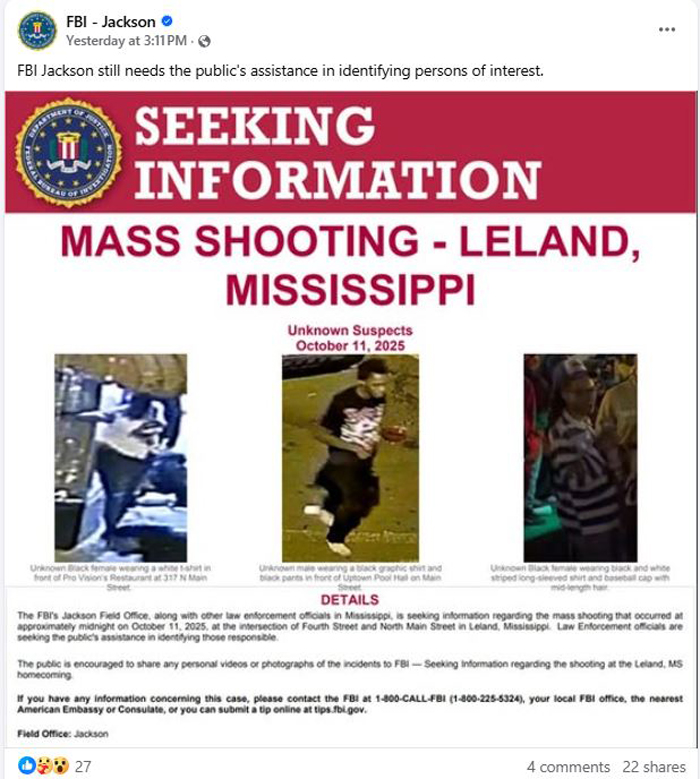 【美新社讯】10月11日周六凌晨,密西西比州利兰市(Leland)在一次返校节庆祝活动中突发重大枪击事件。截至10月15日,共计造成 6 人身亡,10人受伤。这起案件已经有联邦调查局(FBI)接管调查,根据最新消息,目前有 5 名嫌疑人被拘捕。