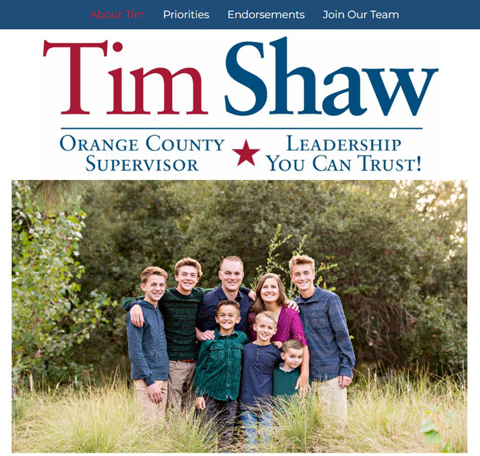 Tim Shaw 表示:“我們需要在橙郡擔任領導職務的人能支持法律和秩序、自由市場和透明的政府。”