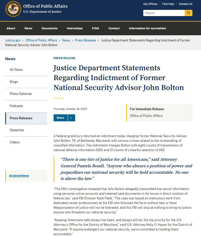 【美新社讯】10月16日周三,美国司法部(DOJ)公告披露:联邦大陪审团对现年 76 岁的前国家安全顾问约翰·博尔顿(John Bolton)提起公诉,指控其犯有与不当处理机密信息相关的严重罪行。起诉书指控博尔顿八项泄露国防信息(NDI)罪名和十项非法保留国防信息(NDI)的罪名。