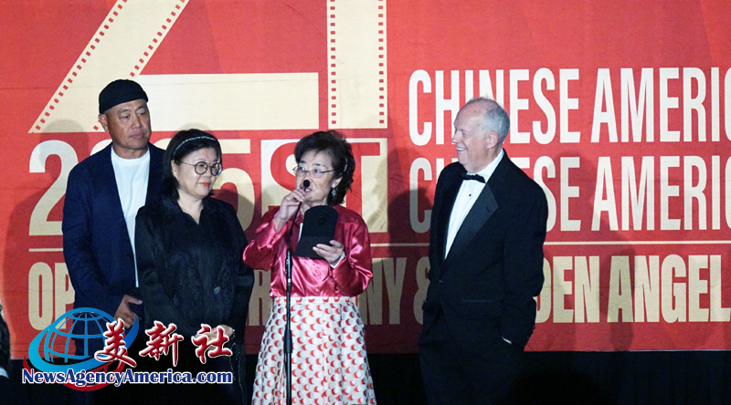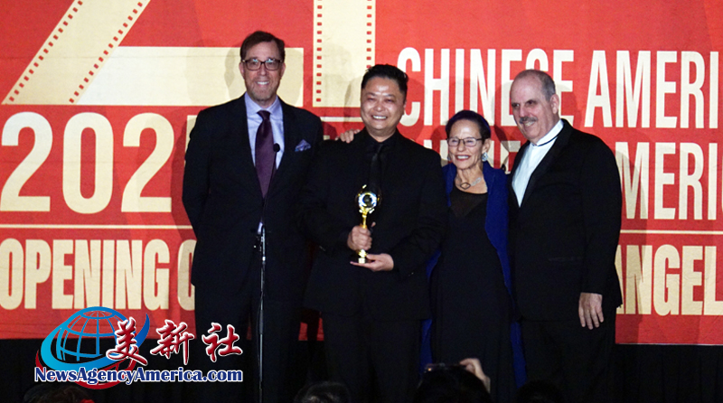 西嘻影业创始人兼首席执行官杨晓培发表获奖感言(左起):杨晓培,中美电影节|中美电视节共同主席、奥斯卡获奖电影《百万宝贝》制片人安德鲁·摩根,前洛杉矶郡郡长夫人、中美电影节|中美电视节共同主席胡慧玲;前洛杉矶郡郡长 迈克尔·安东诺维奇