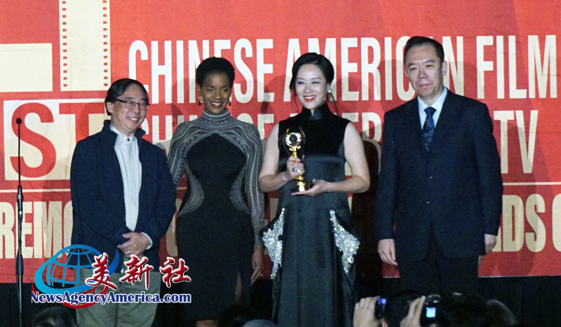 邬君梅发表获奖感言(左起):中美电影节|中美电视节委员、好莱坞著名华裔作曲家、艾美奖得主王宗贤,奥斯卡获奖电影《为奴十二年》主演凯尔·西斯科特,邬君梅,华夏电影发行有限责任公司董事长白轶民