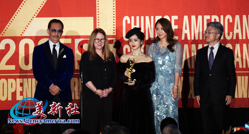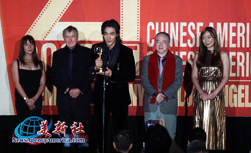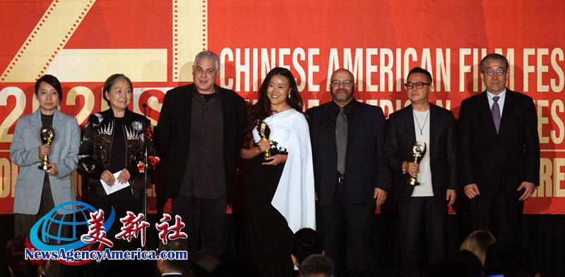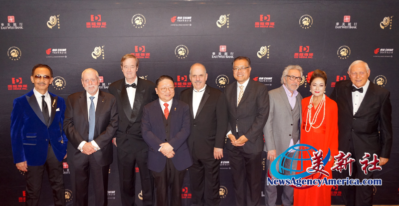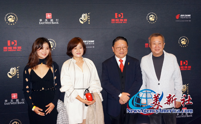 第21届中美电影节最佳男女配角颁奖(左起):中美电影节|中美电视节委员、好莱坞制片人 胡雪莲,著名电影摄影师和导演 安德烈·巴特科维亚克,此沙,著名导演高志森,华纳兄弟探索集团电影事业运营及规划战略副总裁 Lindsey Gui