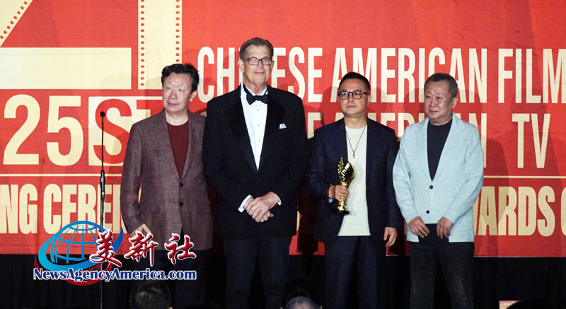 中美电影节年度最佳导演、《捕风追影》导演杨子发表感言(左起):中美电影节|中美电视节委员、好莱坞制片人、导演 罗布·明可夫,杨子导演,前华纳兄弟影业中国区总裁、繁星满天影视有限公司首席执行官艾秋兴,中美电影节共同主席、奥斯卡前任主席、《血战钢锯岭》制片人比尔・麦克尼柯