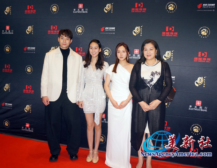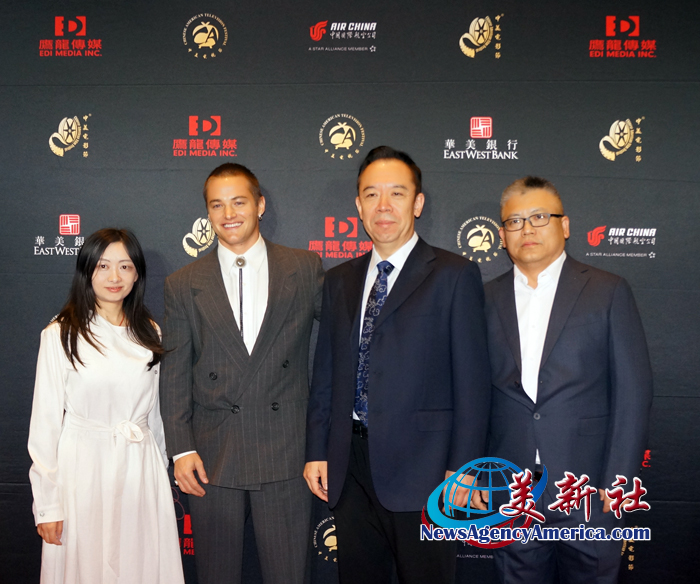 第21届中美电视节年度最具潜力演员奖颁奖(左起):中美电影节委员、好莱坞华裔演员 张宇基;制片人及导演 朱莉・安妮・罗宾逊,沈月,影视演员 孟瑶,中国国际航空公司副总裁兼北美区总经理 彭雷