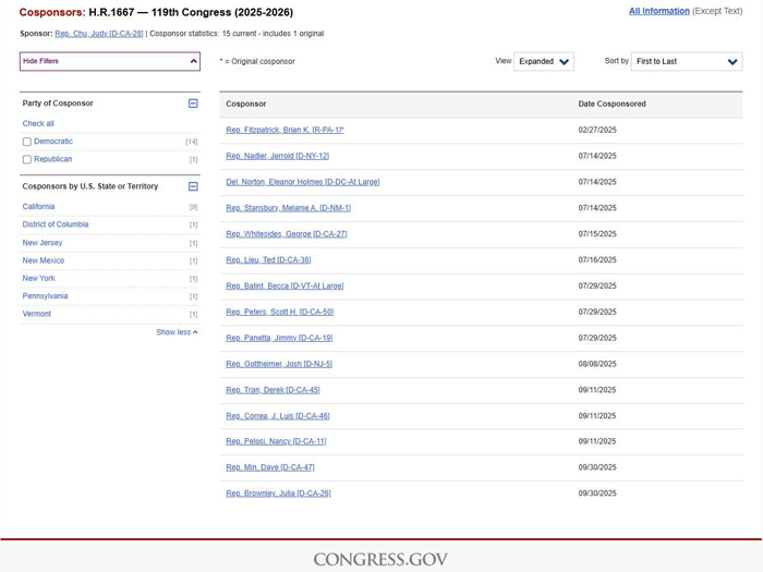 联邦 HR1667 长者针灸法案联署名单(美国国会图片)