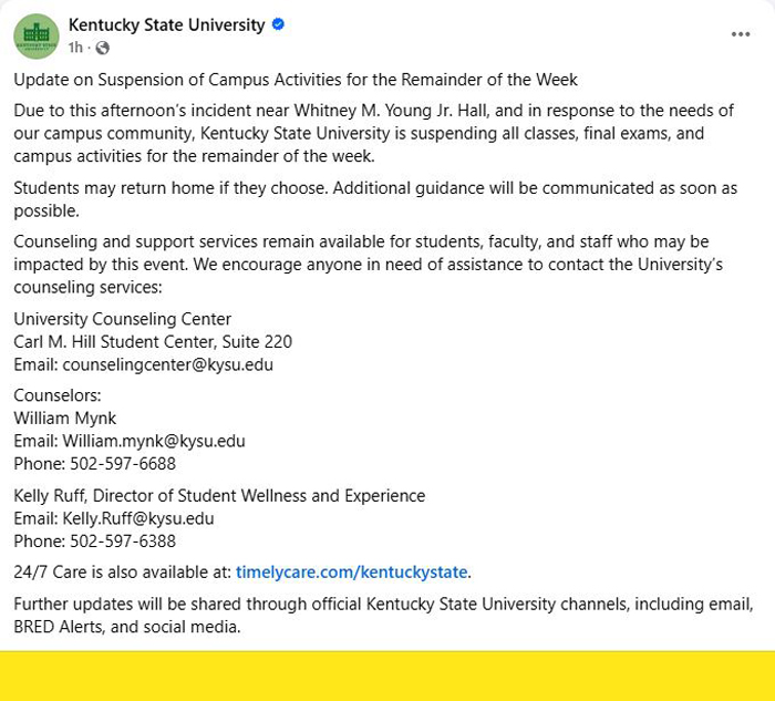 “由于9日下午在 Whitney M. Young Jr. Hall 附近发生的事件,并为了满足校园社区的需求,肯塔基州立大学决定暂停本周剩余时间的所有课程、期末考试和校园活动。