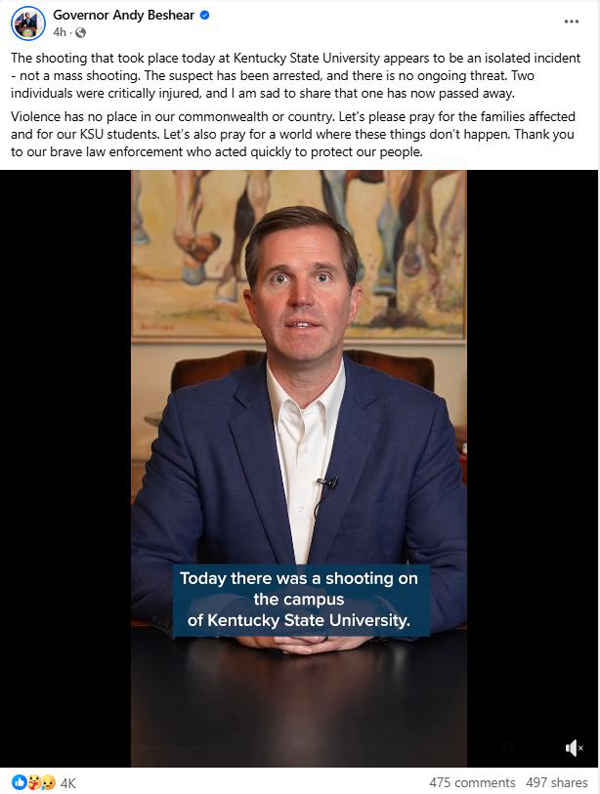 “暴力在我们州乃至我们国家都没有立足之地。让我们为受影响的家庭和肯塔基州立大学的学生们祈祷。让我们也祈祷世界不再发生这样的悲剧。”