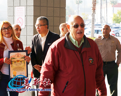 LASD 工業市分局 Glenn Emery、La Puente City 市長 Charlie Kilnakis、Hacienda La Puente 聯合校區教委主席 Gino Kwok、洛杉磯郡第一區郡長蘇麗絲(Hilda L. Solis)辦公室代表 Ryan Serrano 與華興保險總裁張國興一同出席活動。