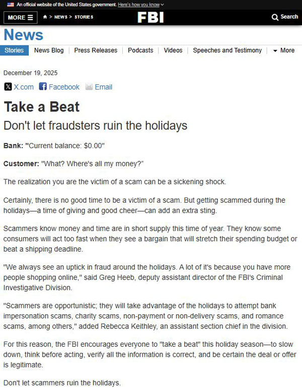 🔰 “我们每年假期期间都会发现欺诈案件有所增加。这很大程度上是因为更多的人选择网上购物,”联邦调查局刑事调查部门副助理主任格雷格·希布 (Greg Heeb) 强调说。