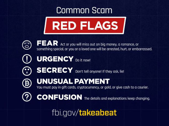 【美新社讯】12月19日周五,美国联邦调查局(FBI)警告公众,警惕常见诈骗的“红旗警告(Red Flag)”,不要让骗子毁了你的假期!