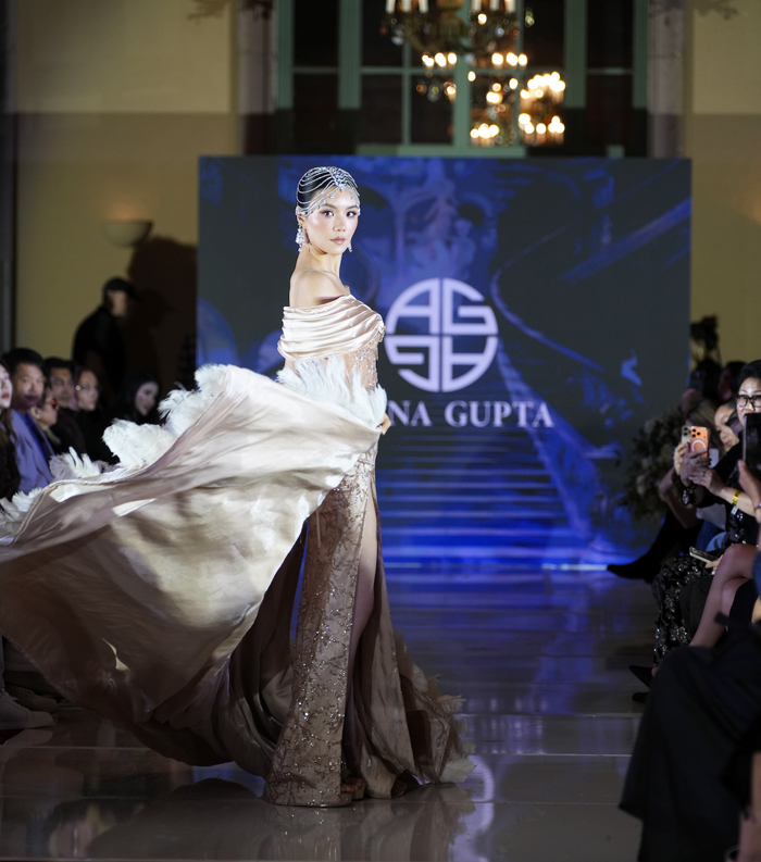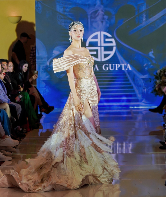 好莱坞当红设计师 Anna Gupta 的高定奢华晚装系列压轴登场。多位好莱坞超模强势加盟,令整场大秀星光云集、气势恢宏。