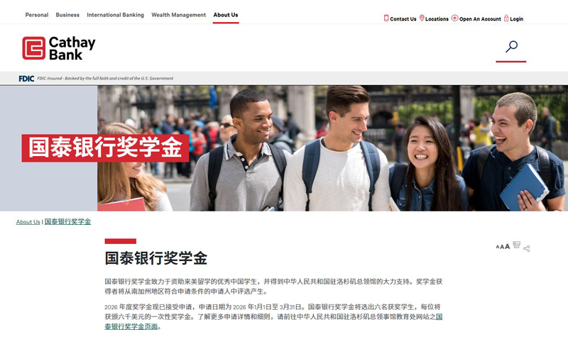 欲了解更多关于奖学金详情与申请细则,请浏览中华人民共和国驻洛杉矶总领馆教育处网站:https://losangeles.lxgz.org.cn/losangeles2025/xwdt/tzgg/2026010411151260668/index.html;或国泰银行网站:https://www.cathaybank.com/about-us/cathay-bank-scholarship。