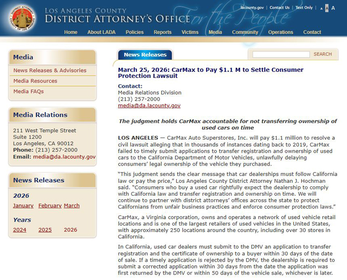 【美新社讯】2026年3月25日,洛杉矶郡地区检察长(LADA)霍赫曼(Nathan J. Hochman)办公室发布公告: CarMax Auto Superstores, Inc. 将支付 110 万美元,以了结一项民事诉讼。
