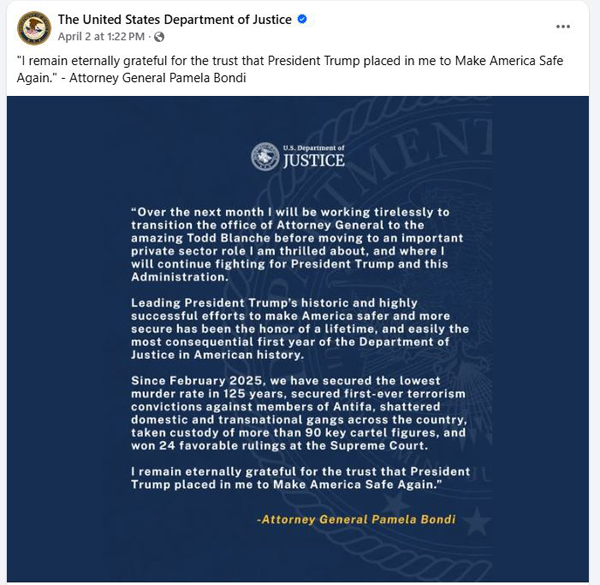【美新社讯】4月2日周五,美国司法部(DOJ)部长暨总检察长帕梅拉•邦迪(Pamela Bondi)将离职,接替她的将是副部长托德·布兰奇(Todd Blanche)。交接工作将在一个月内完成,美国司法部通过社交媒体发布了这一消息,据称卸任原因是前往“私营部门”。