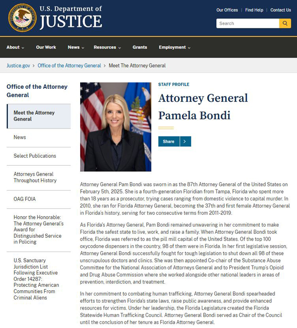 司法部长/总检察长帕梅拉•邦迪(Pamela Bondi)”
