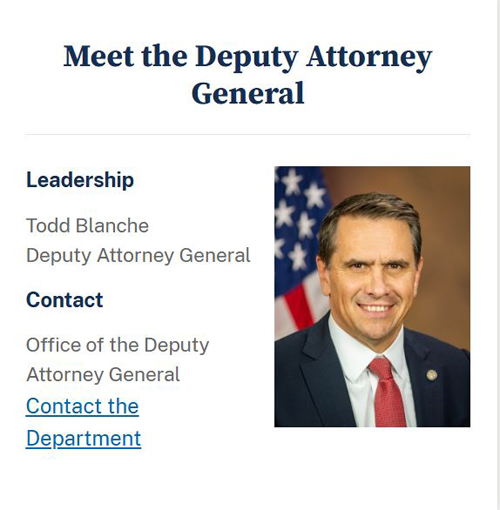 關鍵詞: 美国司法部,DOJ,帕梅拉•邦迪,Pamela Bondi,托德·布兰奇,Todd Blanche