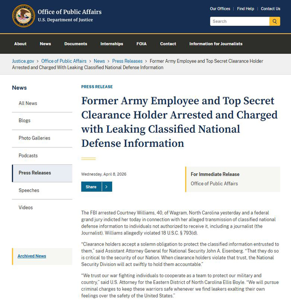 “考特尼·威廉姆斯曾宣誓效忠,承诺作为一名支援陆军某特种军事单位的雇员,全力守护国家的机密;然而,她涉嫌背弃了这一誓言,将机密信息泄露给媒体机构,从而将我们的国家、前线将士以及盟友置于险境,”FBI 反间谍与谍报处助理主任罗曼·罗扎夫斯基(Roman Rozhavsky)表示。“这份起诉书应当作为一记严厉的警钟,警示所有现任及前任安全权限持有人——切勿妄图背叛你们所肩负的信任。如果你们未经授权披露机密信息,从而危及国家安全,FBI必将追究你们的刑事责任。”