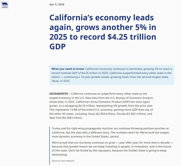 【美新社讯】4月9日,加州州长纽森(Gavin Newsom)办公室发布公告:加州经济继续保持主导地位,2025年 GDP 增长 5%,名义 GDP 达到创纪录的 4.25 万亿美元。加州的经济表现超越了全美所有其他州 -- 延续了长达 16 年的增长势头,且在 2025 年的增速快于全美第二大经济体 -- 德克萨斯州。