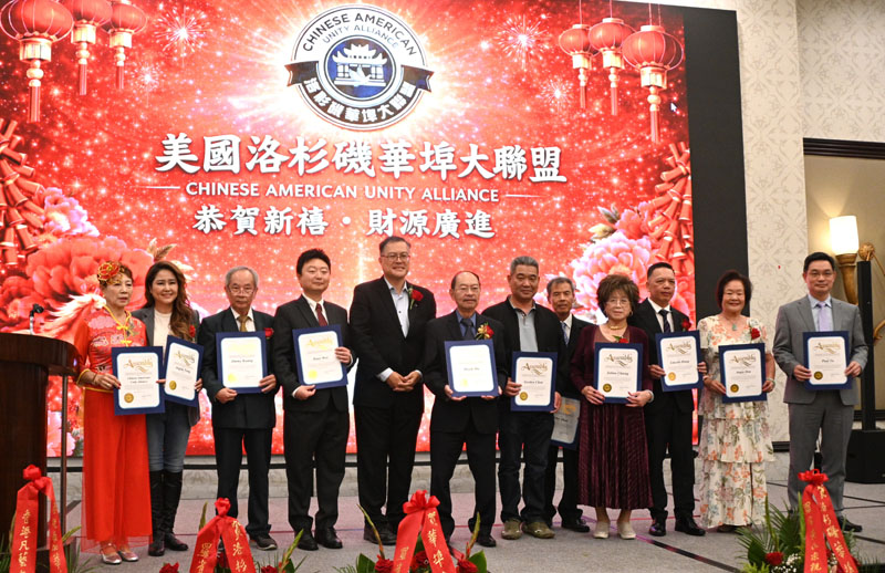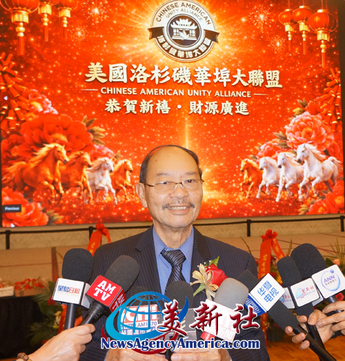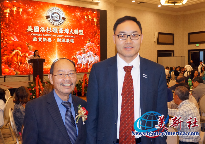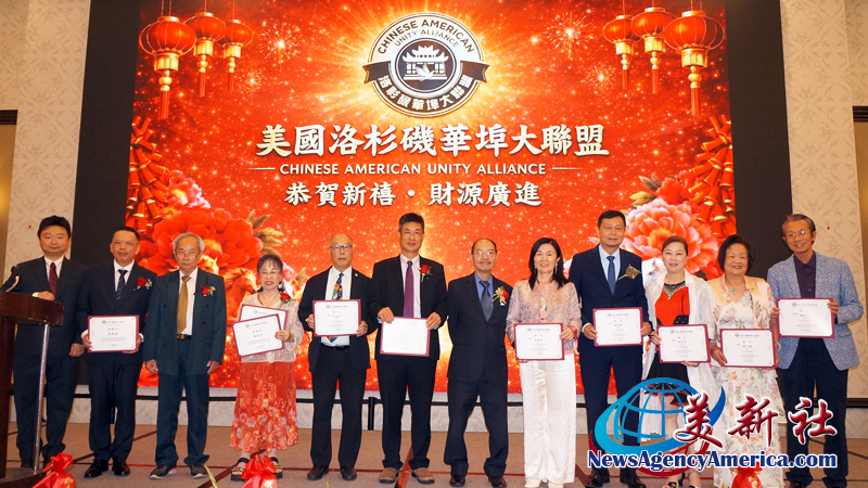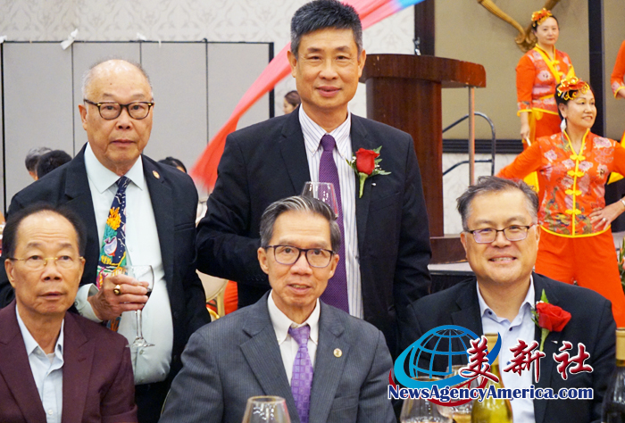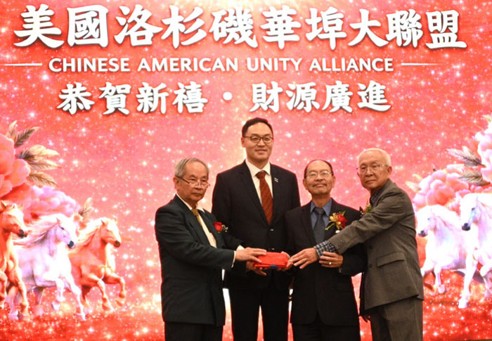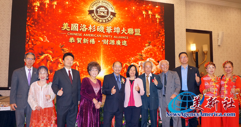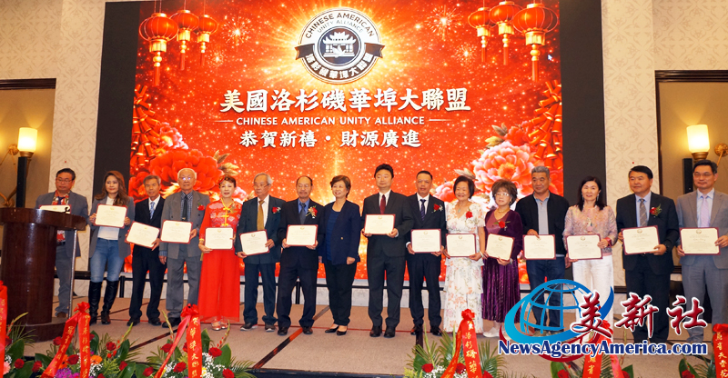 【洛杉矶讯】4月11日,美国洛杉矶华埠大联盟于希尔顿半岛酒店举办新春联欢庆祝宴会。美国洛杉矶华埠大联盟(以下简称华埠大联盟)主席马树荣、副主席邝志民、理事长杨得成皆喜获连任。