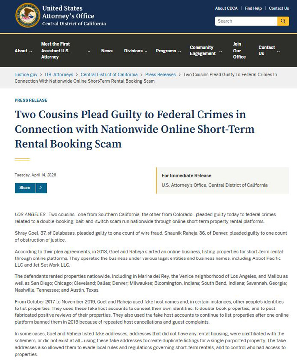 🚨 根据二人的认罪协议,Goel 和 Raheja 于 2013 年创办了一家在线业务,通过各类在线平台发布房源进行短租。他们通过多个法律实体和商业名称运营该业务,其中包括 Abbot Pacific LLC 和 Jet Set Work LLC。