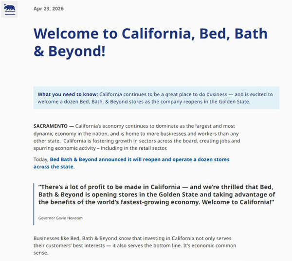 關鍵詞: 加州,加州州长,纽森,Gavin Newsom,Bed Bath & Beyond,重返加州,加州领跑全国