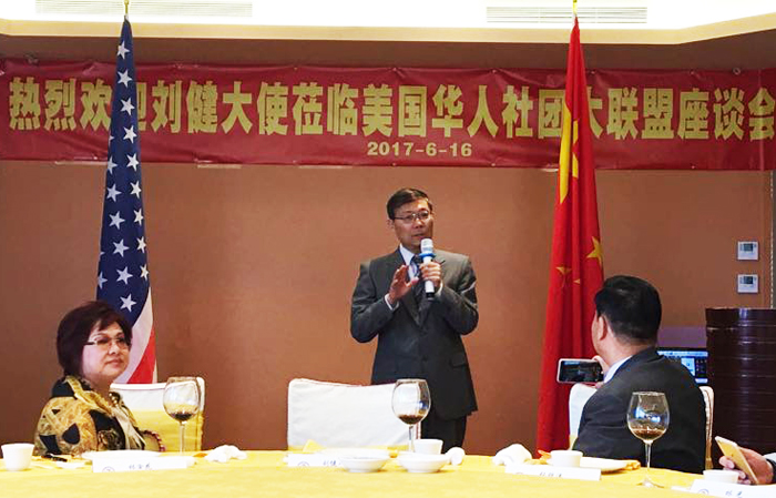 【美新社訊】中国驻洛杉矶总领事刘健于6月16日出席美国华人社团大联盟举办的座谈会,听取了大联盟主席林淦花等负责人工作情况的介绍。