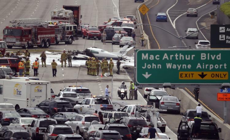 【美新社綜合報導】一家小型雙引擎飛機今天上(星期五)在Santa  Ana的405號高速公路上墜毀,墜毀時飛機試圖在John Wayne機場降落,並爆發了熊熊火焰。