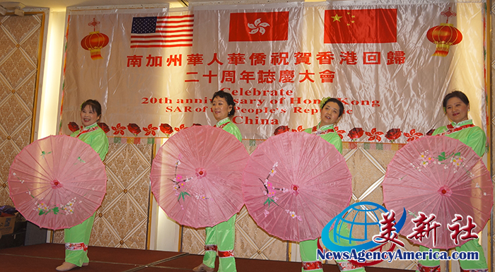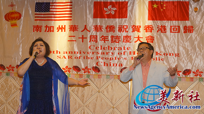 【美新社記者劉驍宗蒙特利公園市報導】美國西部時間6月30日,暨中國時間7月1日,由美國澳門海外聯誼會,港澳台華僑聯合總會,美國世界中醫藥針灸學會學會,加州中醫政治聯盟,美國廣東會館等社團發起,南加州港澳僑胞聯合舉辦的慶祝香港回歸20週年晚宴晚會,於蒙市金都凱旋皇宮酒樓歡樂登場。