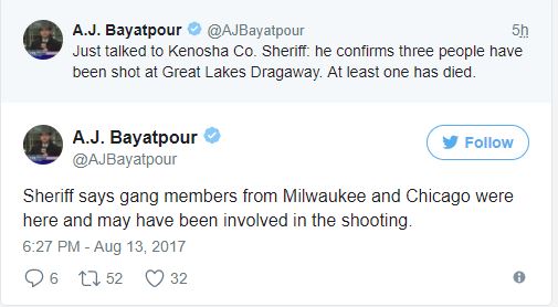 【美新社綜合編譯報導】2017年8月13日晚間大約7時許,美國威斯康星州知名的賽車場 -- 座落在Union Grove鎮上的Great Lakes Dragaway,發生一起槍擊案件。一名槍手向三個正在買食物的男子近距離開槍。造成兩人當場死亡,另外一人在送往醫院的途中死亡。槍擊案發生地、Union Grove鎮地處威斯康星州密爾沃基市 (Milwaukee)市南部約25邁處。