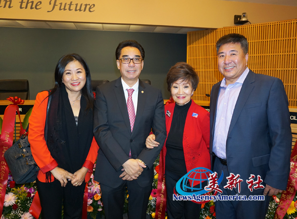 美國聯邦眾議員趙美心(圖左),林達堅(圖右)宣誓就職蒙特利公園市市長