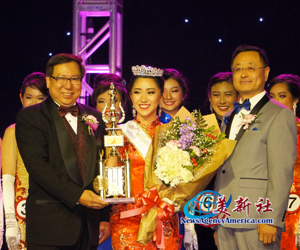 18歲就讀南加大6號選手梁瀅(Catherine Liang)摘得本次決賽后冠(圖中),羅省中華總商會主席莊佩源(圖左)、羅省中華總商會會長李軍(圖右)