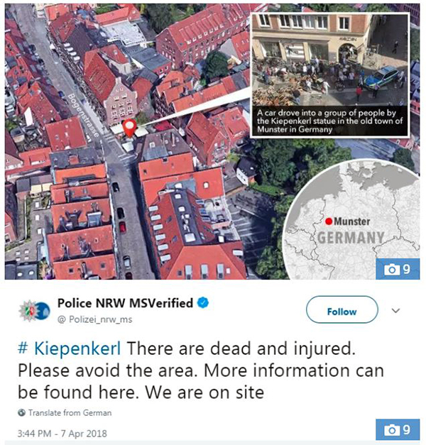 當地7日,下午3點半左右,明斯特(Muenster)老城區內一處有名的餐廳(Grosser Kiepenkerl Restaurant)的露天用餐區,人們正悠閒的用餐和閒聊中,肇事貨車突然出現,直接沖向人群,撞到了大片的民眾。司機隨後,在車內開槍自盡身亡。警方當時認為,可能還有其他的嫌疑人,封鎖了老城區,進行搜捕。