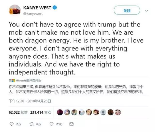 報道稱,這並不是韋斯特首次發佈“老朋友”川普相關推特,早些時候他還稱川普是“兄弟”,還說他們都擁有“龍一般的能量”。