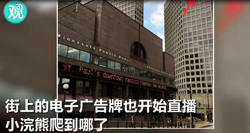 於是,這隻浣熊一夜成名。網友實時直播它的爬樓進展,美國多家媒體也都在推特上爲其直播,連瑞銀大廈外的廣告牌也參與了。幾乎所有人都在關心,這隻“乾脆面”到哪了,危不危險。