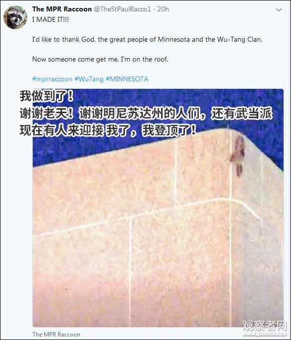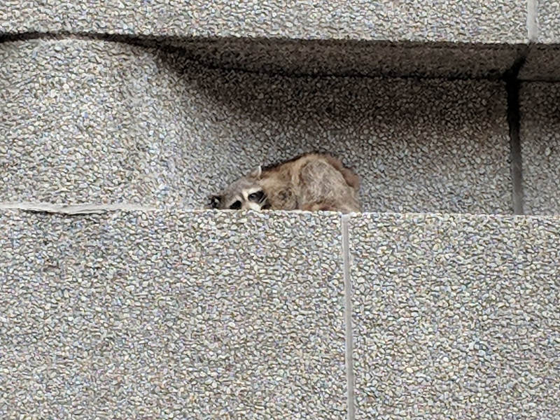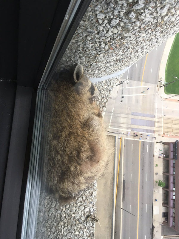 據《華盛頓郵報》報道,這隻浣熊一開始被困在瑞銀大廈隔壁的一幢樓,沒東西吃也沒水喝。它可能受到了驚嚇,而它似乎相信逃離危險的最好方法就是往上爬。